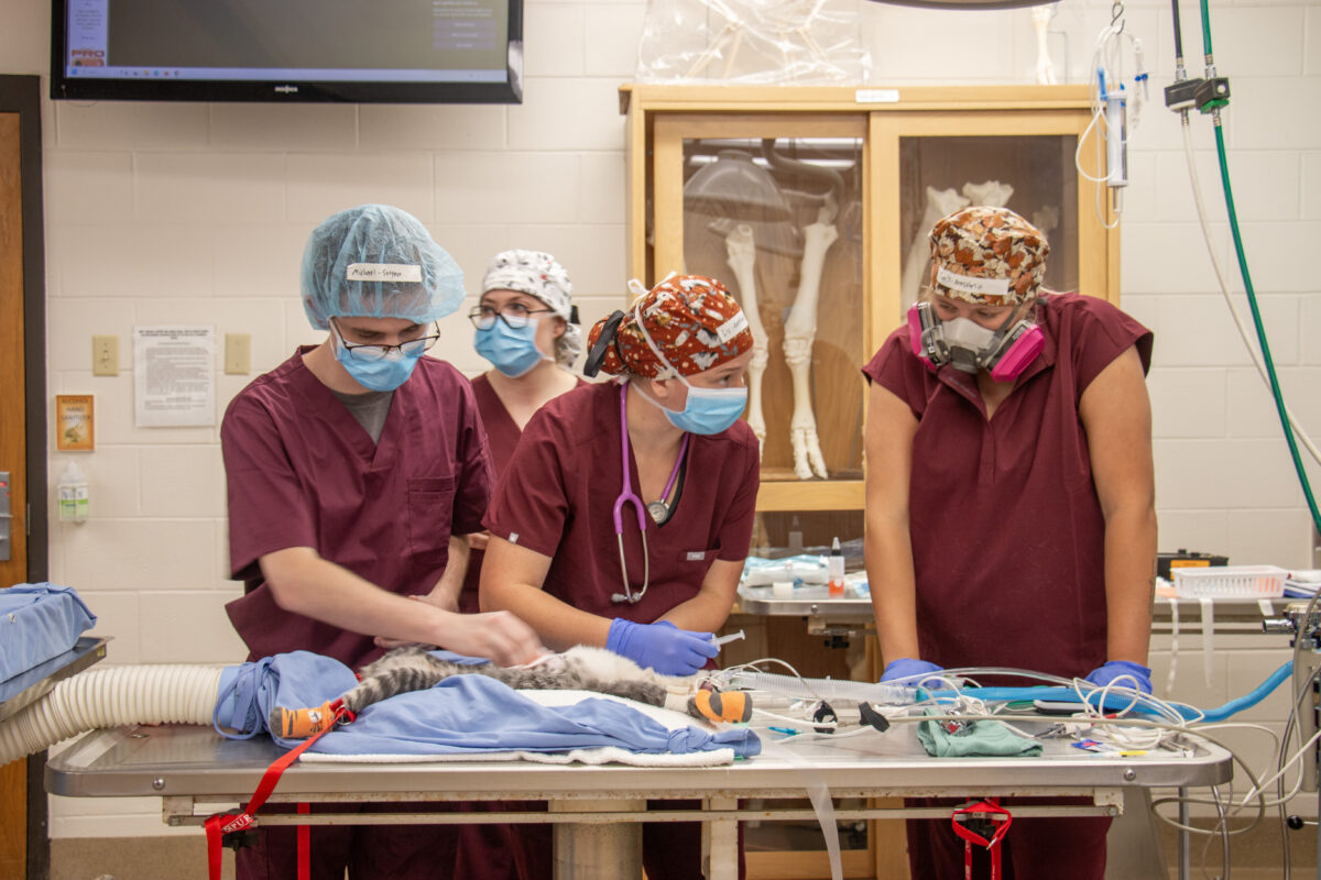 Working in teams of four — two as anesthetists, two as surgeons — the students care for a feline patient through the entire surgery process, under the guidance of faculty and teaching staff. Upon arrival, they perform physical exams and monitor for any existing ailments. On surgery day, they give the cat premeds, induce anesthesia, transport them to the operating room, prepare for surgery, and perform a spay procedure. Finally, they closely monitor the patient through recovery and discharge, producing detailed medical records throughout the whole process.