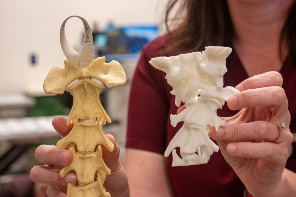 Cameron used the CT scan of Timmy’s spine to produce a 3D-printed model of his backbone. The model proved to be “critical,” Cameron says, because it allowed the clinicians to prepare using an exact replica of Timmy’s unusual anatomy.